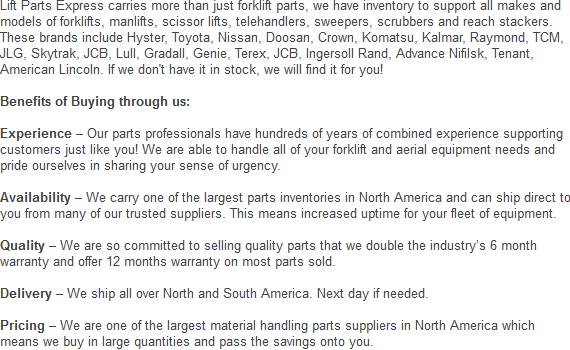 For your entire fleet of forklifts, we provide the best prices on all our parts. For a quote on a part or attachment we offer, please call us at: